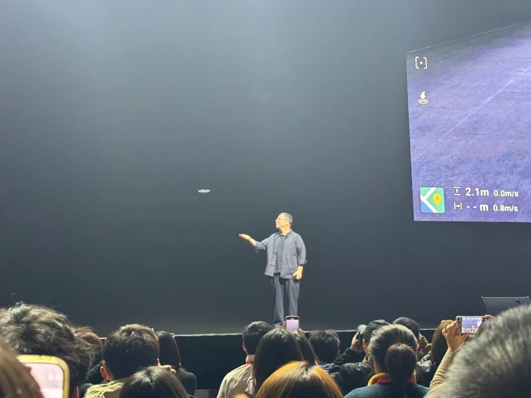 后续,又推荐了影石insta360旗下影翎,全景无人机公司,现场直接体验机器,全场飞一圈“扫射”观众们的头顶。