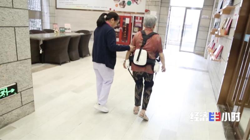 除了这款框架式外骨骼机器人,还有一款便携式的“机器外挂”。今年87岁的李桂英老人穿上它以后,可以丢掉拐杖,进行散步锻炼。